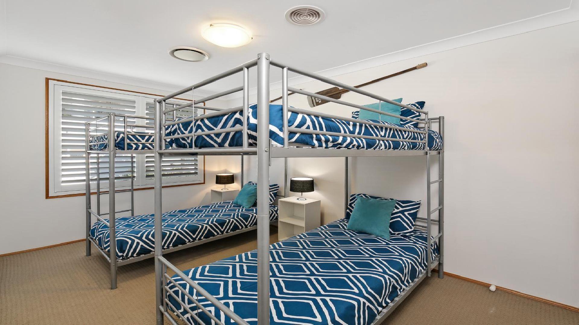 in robes and ensuite with shower. Bedroom 2 has a queen bed, bedroom 3 has a single bed and a double bed, while bedroom 4 has two bunk beds. All bedrooms contain built-in robes.